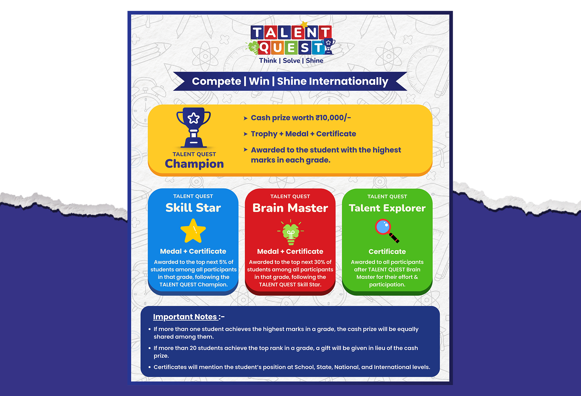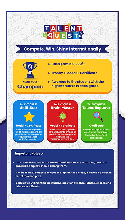skills confidently. TALENT QUEST helps students build and showcase skills like Verbal Reasoning, Pictorial Reasoning, Logical Reasoning, Critical Thinking, Problem Solving, and General Knowledge. Itβs a platform for students to shine in their own unique way.